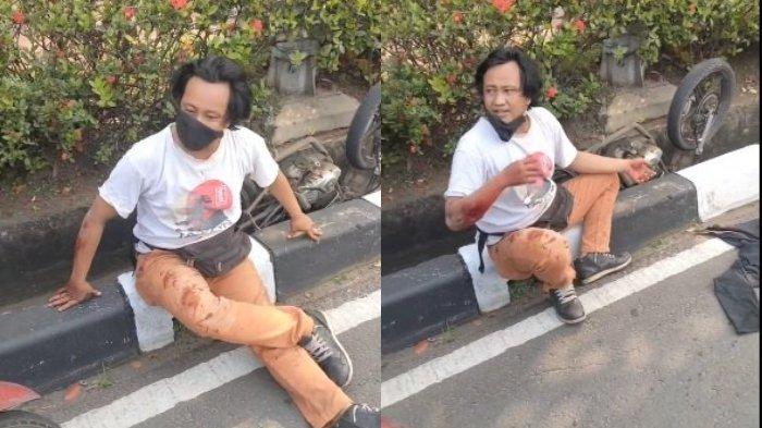 Seorang pria yang diduga pelaku begal payudara terjatuh dari motornya setelah dipepet pengendara lain di Jalan Industri Raya, Kemayoran, Minggu (23/5) kemarin.