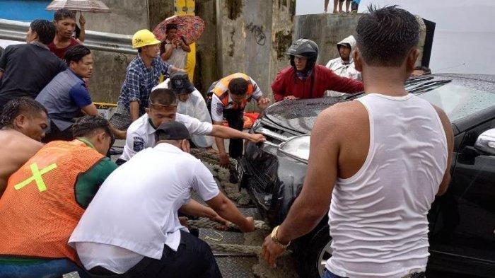Mobil tersebut jatuh saat hendak turun dari kapal karena ramp door KMP Ihan Batak tiba-tiba patah.