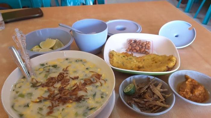 4. Penyajian: Sajikan bubur jagung dengan perkedel dan bahan pelengkap. (2)