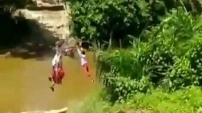 Dalam video yang beredar, dua bocah perempuan dan 1 laki-laki tersebut nampak bergelantung memegang tali melewati sungai yang bedar.
