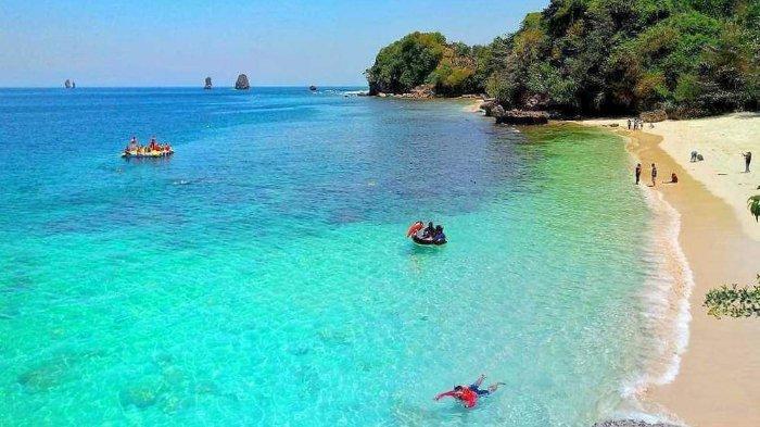 Di pantai ini pengunjung bisa menikmati pasir yang putih dengan air laut jernih yang memiliki tiga warna berbeda.