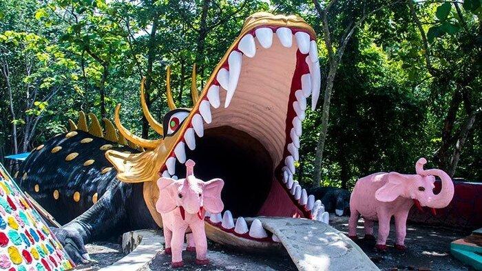 Pintu masuk yang unik berbentuk kadal raksasa telah diperbaiki dan dicat sehingga terlihat menarik.