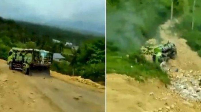 Ketika berada di turunan, truk tersebut tampak hilang kendali dan tergelincir hingga ke pinggir jurang.