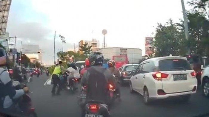 Dalam video yang beredar, seorang polantas tampak memberhentikan dan seperti mendorong pengendara yang berboncengan saat berhenti di lampu lalu lintas.