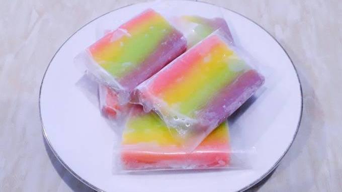 Setelah beku, es gabus diberi warna makanan sehingga warnanya menjadi pelangi.