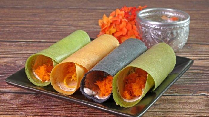 TRIBUNNEWSWIKI.COM - Khanom buang merupakan camilan khas Thailand berupa crepes atau pancake renyah dengan toping foi thong dan butter cream atau whiped cream.