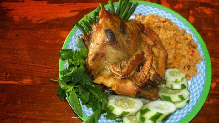Sajian tersebut berupa ayam kampung utuh bakar yang dilengkapi dengan saus santan dan kencur.