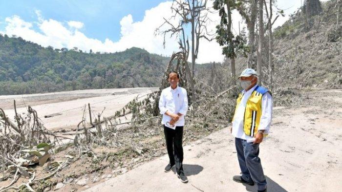 TRIBUNNEWSWIKI.COM - Presiden Joko Widodo (Jokowi) meninjau langsung lokasi terdampak erupsi Gunung Semeru di Kabupaten Lumajang, Jawa Timur, Selasa (7/12/2021).