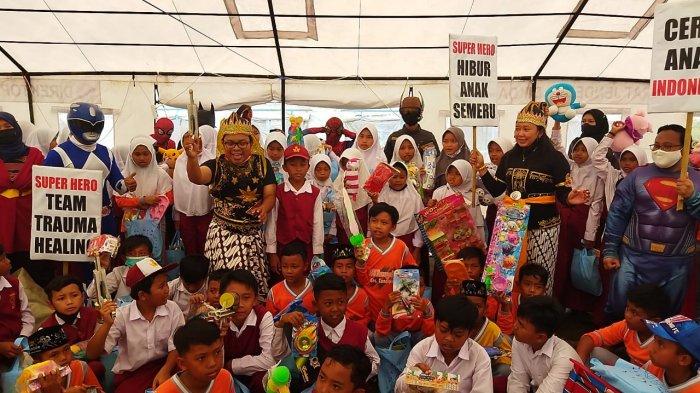 TRIBUNNEWSWIKI.COM - Sejumlah relawan antinarkoba yang berasal dari Kabupaten Sukoharjo, Jawa Tengah, menyalurkan sejumlah bantuan khusus untuk anak-anak pengungsi terdampak erupsi Gunung Semeru di SDN Penanggal 01, Desa Penanggal, Kecamatan Candipuro, Kabupaten Lumajang, Jawa Timur, pada Kamis (13/1/2022).