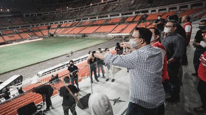 TRIBUNNEWSWIKI.COM - Gubernur DKI Jakarta, Anies Baswedan, menonton grup band tanah air, Nidji, tampil melakukan uji coba sound system di Jakarta International Stadium (JIS), pada Minggu (16/1/2022).