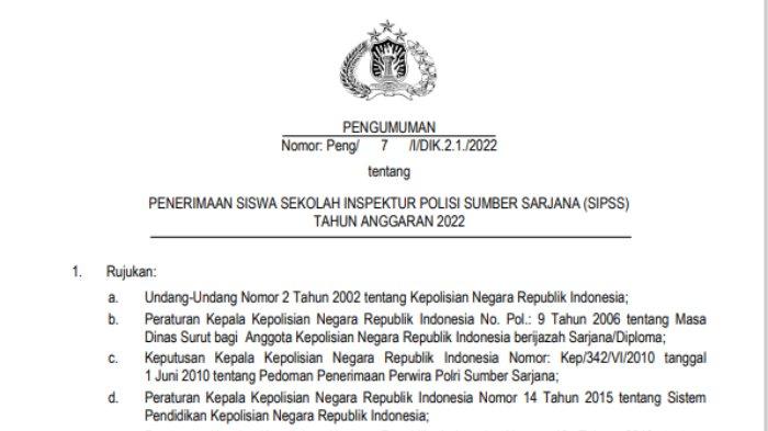 Pendaftaran siswa Sekolah Inspektur Polisi Sumber Sarjana (SIPSS) tahun anggaran 2022 telah dibuka pada Rabu (26/1/2022).