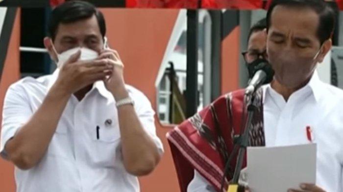 Dalam video yang beredar, Luhut terlihat berdiri di belakang Jokowi bersama jajaran menteri lainnya, termasuk Menteri PUPR Basuki Hadimuljono dan Menparekraf Sandiaga Uno.