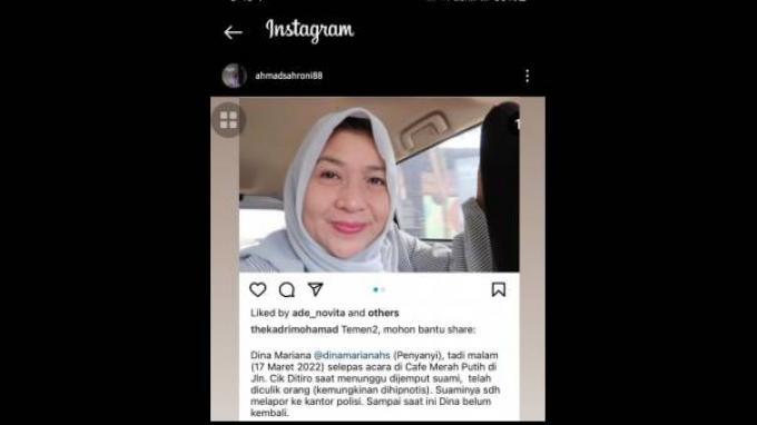 Dalam keterangan foto tersebut, Dina dikatakan diculik usai mengisi acara di Cafe Merah Putih, Jalan Cik Ditiro, Jakarta Pusat.