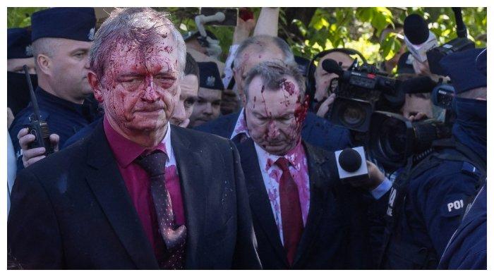 TRIBUNNEWSWIKI.COM - Duta Besar Rusia untuk Polandia, Sergey Andreev, disiram dengan cat merah mirip darah saat mengunjungi makam tentara Soviet di Warsawa, (9/5/2022).
