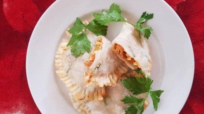 5. Bagi adonan menjadi 20 bagian, baluri dengan tepung kanji pada papan giling, pipihkan adonan sampai tiping dengan rolling pin. Tambahkan satu sendok makan isian di tengah, lipat dan rapatkan sisinya seperti membuat pastel. Lakukan hingga bahan habis.