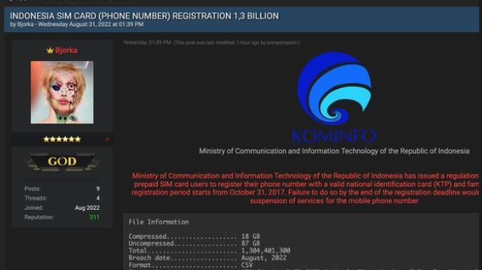 TRIBUNNEWSWIKI.COM - Sekitar 1,3 miliar nomor kartu seluler pengguna Indonesia dan nomor NIK (nomor induk kependudukan/nomor KTP) diduga bocor, kemudian dijual di forum online "Breached Forums".