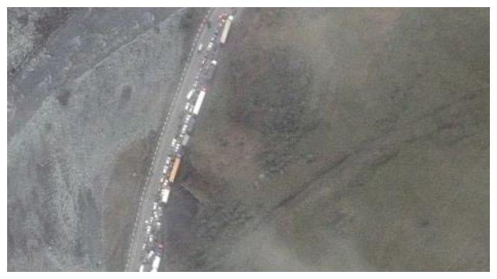 Foto satelit dari Maxar, sebuah perusahaan bermarkas di Amerika Serikat (AS), memperlihatkan adanya kemacetan hingga 16 km. Foto itu turut dibagikan oleh akun Twitter @TpyxaNews pada Selasa pagi, (27/9/2022).