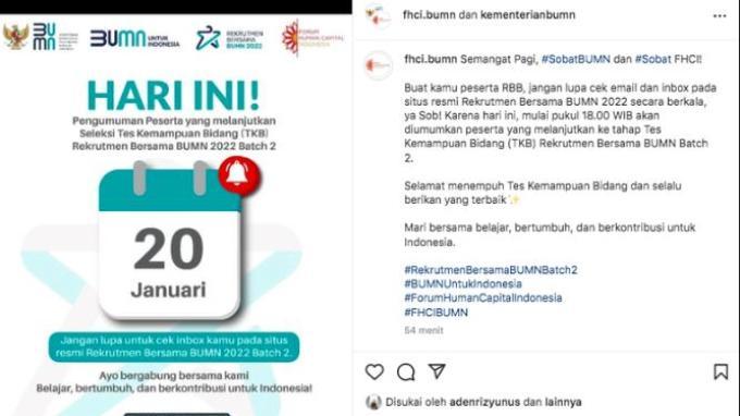 Panitia rekrutmen bersama BUMN, Forum Human Capital Indonesia (FHCI) lewat akun resmi Instagramnya, @fhci.bumn menjelaskan peserta dapat melakukan pengecekan berkala alamat e-mail dan kotak masuk di laman resmi rekrutmen.
