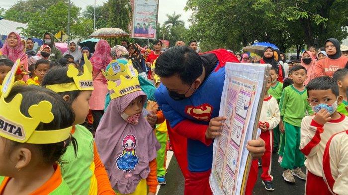 "Superhero" yang terdiri dari Gatotkaca, Batman, Superman, hingga Power Rangers ini turun ke jalanan CFD sabil mengimbau anak-anak agar menghindari jajanan bahaya ciki ngebul.