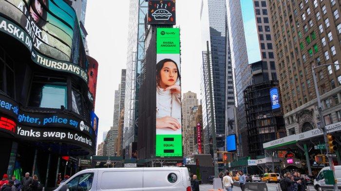 Billboard Spotify di Times Square, New York, yang menampilkan wajah Raissa menunjukan upaya Spotify dalam mengupayakan kesetaraan gender di industri musik.