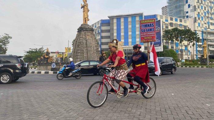 TRIBUNNEWSWIKI.COM - Pasangan suami istri (pasutri) berkostum superhero Gatotkaca dan Supergirl memenuhi nazar bersepeda atau gowes dengan jarak tempuh 20 kilometer setelah tim nasional (timnas) sepak bola Indonesia U-22 berhasil menjadi juara dan meraih medali emas pada ajang SEA Games 2023 di Kamboja.