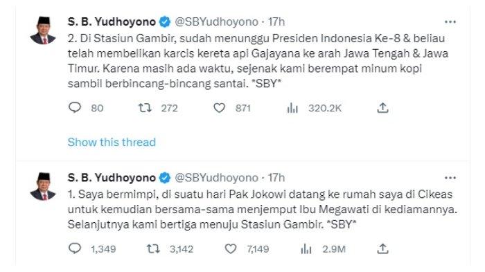 SBY menceritakan mimpinya itu lewat akun Twitter miliknya, @SBYudhoyono, hari Senin, (19/6/2023), atau sehari setelah putranya yang menjadi Ketua Umum Partai Demokrat, Agus Harimurti Yudhoyono (AHY), bertemu dengan putri Megawati yang menjabat sebagai Ketua Umum PDI Perjuangan, Puan Maharani.