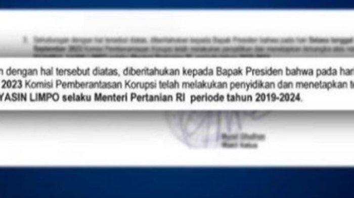 "Sehubungan dengan hal tersebut di atas, diberitahukan kepada Bapak Presiden bahwa pada hari Selasa tanggal 26 Septemberr 2023, Komisi Pemberantasan Korupsi telah melakukan penyidikan dan menetapkan tersangka atas nama SYAHRUL YASIN LIMPO selaku Menteri Pertanian RI periode tahun 2019-2024," demikian bunyi surat itu dikutip dari Warta Kota Live yang mengutip Kompas TV.