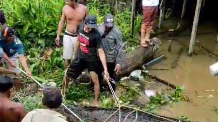 Pada video lain, buaya berhasil dibawa ke daratan setelah ditangkap warga.