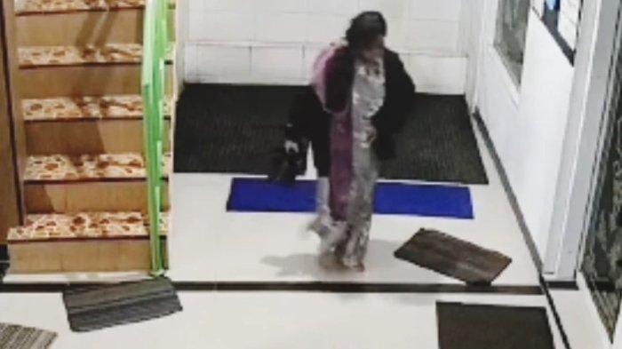 Dalam video yang beredar, sosok wanita misterius ini awalnya terlihat berbaring teras dekat tangga Mushola.