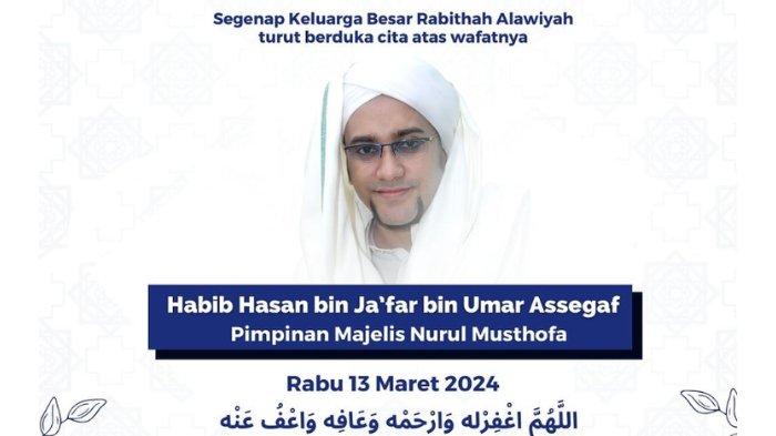 "Segenap Keluarga Besar Rabithah Alawiyah turut berduka cita atas wafatnya Habib Hasan bin Ja'far bin Umar Assegaf (Pimpinan Majelis Nurul Musthofa) pada hari Rabu, 13 Maret 2024," tulis unggahan tersebut.