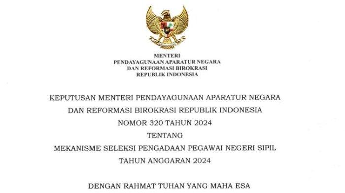 Syarat CPNS 2024 ini tertera dalam Keputusan Menteri (Kepmen) Pendayagunaan Aparatur Negara dan Reformasi Birokrasi Nomor 320 Tahun 2024 tentang Mekanisme Seleksi Pengadaan Pegawai Negeri Sipil Tahun Anggaran 2024.
