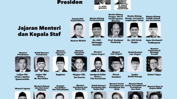 Simak inilah Susunan Lengkap Kabinet Prabowo - Gibran yang diumumkan Istana Kepresidenan pada Minggu (20/10/2024):