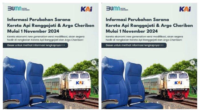 “Mulai 1 November 2024, KA Ranggajati dan Argo Cheribon Fakultatif akan menggunakan kereta Ekonomi New Generation Modifikasi,” tulis @kai121_ dalam sebuah caption di akun Instagram resminya.