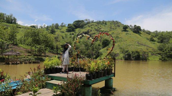 Beragam spot foto tersedia, seperti dermaga kayu kecil yang menjorok ke telaga, ornamen berbentuk hati, jembatan bambu, gazebo, dan getek di tepi air.